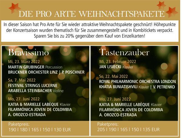 Bestellen Sie jetzt Karten oder auch attraktive, preisermäßigte Geschenk-Pakete für die Pro Arte Konzerte Mannheim, die wir Ihnen für den Gabentisch geschnürt haben.