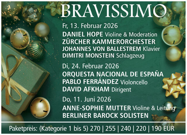 | Donnerstag, 11. Juni 2026, 20:00 Uhr Anne-Sophie Mutter Violine & Leitung Berliner Barock Solisten DARVISHI „Likoo“ PREVIN Violinkonzert Nr. 2 MOZART Violinkonzert Nr. 1 B-Dur KV 207 MOZART Violinkonzert Nr. 5 A-Dur KV 219 * Im Weihnachts-Paket BRAVISSIMO enthalten. | | | |
