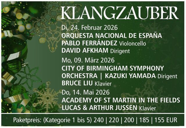 | Dienstag, 24. Februar 2026, 20:00 Uhr Orquesta Nacional de España Pablo Ferrández Violoncello David Afkham Dirigent TURINA „Danzas fantásticas“ SCHUMANN Cellokonzert a-Moll STRAUSS „Don Juan“ DE FALLA Suite Nr. 2 aus „El sombrero de tres picos“ (Der Dreispitz) * In den Weihnachts-Paketen BRAVISSIMO & KLANGZAUBER enthalten. | | | |